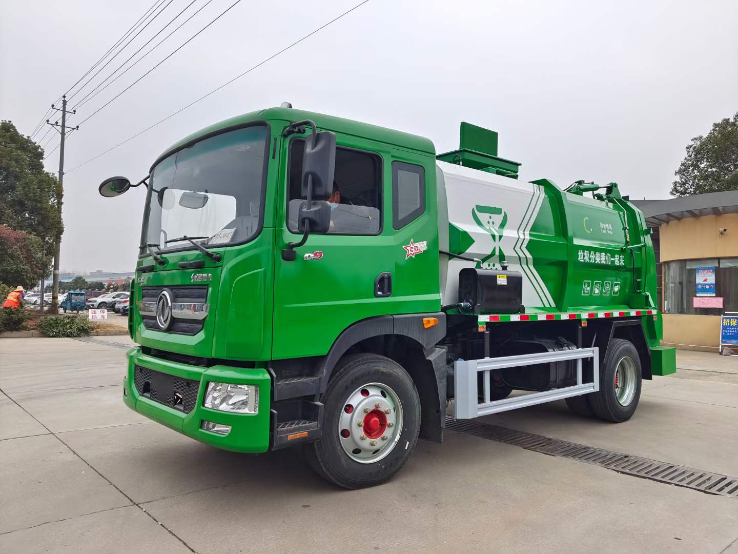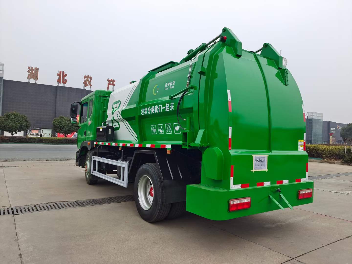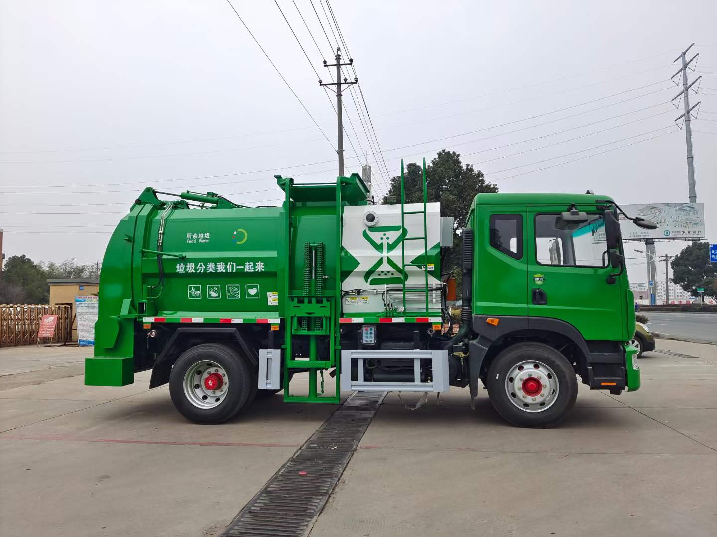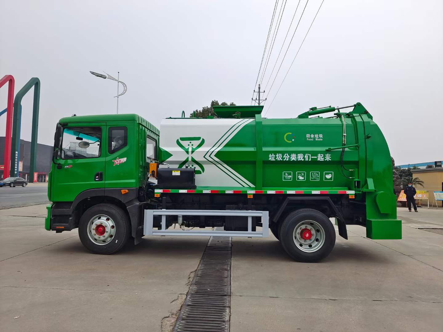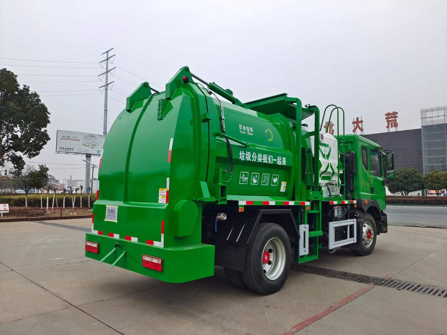 5、密閉排料(選裝):不用后門打開,液態垃圾可以通過管道路排出,固態垃圾可以通過旋轉絞籠擠壓排放出車廂。